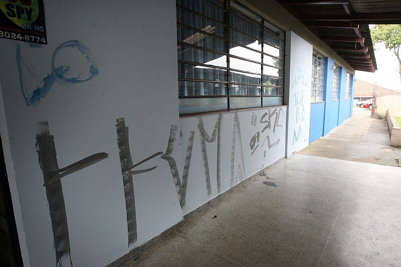Todas as paredes externas da escola no Bairro Alto haviam sido pichadas