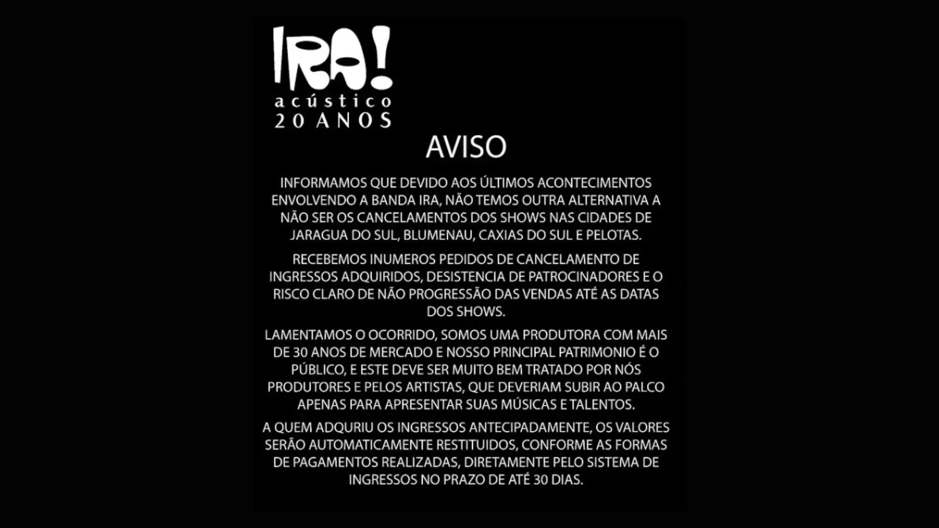 O pedido de Marcos Valadão foi atendido de forma rápida. Cerca de duas semanas após a sua fala em Minas Gerais, a banda Ira! teve shows cancelados no Rio Grande do Sul e em Santa Catarina.