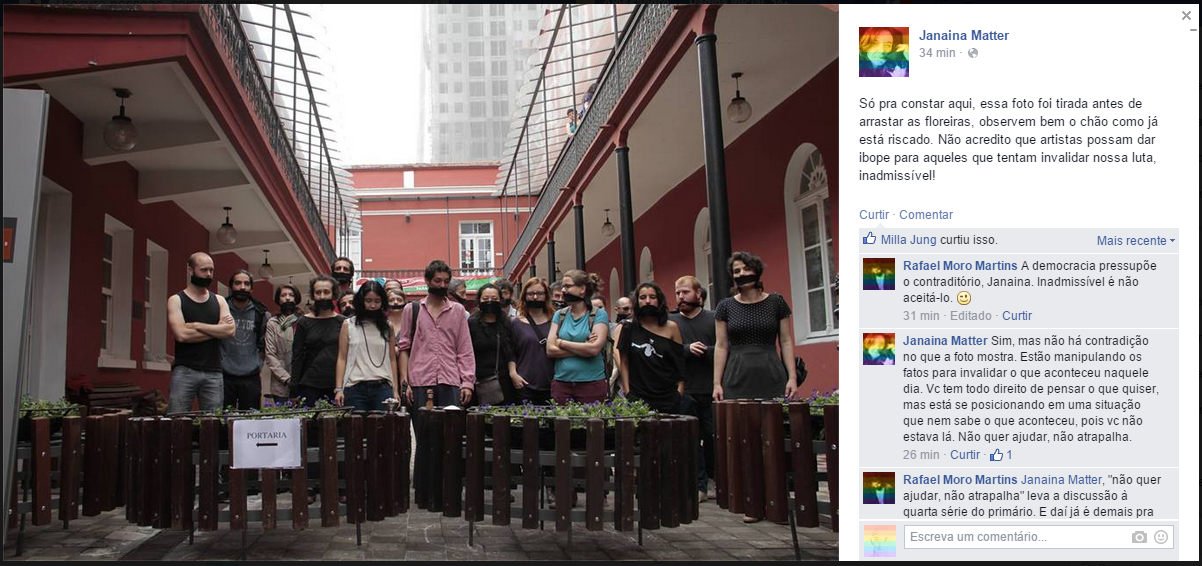 Independentemente da motivação do protesto dos artistas da Frente Acorda Curitiba no Solar do Barão, na tarde do último sábado, está dando o que falar o estrago provocado pela manifestação nos ladrilhos hidráulicos do prédio histórico. Ao arrastarem floreiras, o revestimento centenário foi riscado. As intenções do grupo e sua consciência dos valores arquitetônicos locais estão sendo questionadas por outra parcela de pessoas ligadas à produção cultural da cidade no post em que a denúncia dos estragos foi feita. No caso de o grupo estar fazendo reivindicações legítimas, independentemente de seus integrantes estarem certos ou não, seus argumentos podem perder força e perder razão diante se seus discursos não estiverem par a par com suas ações.