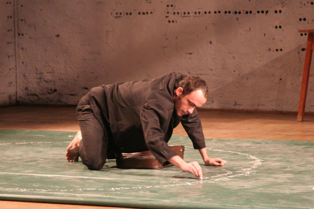 Em 2010, o grupo dá as caras a partir de abril. O projeto se chama Homem Piano e vem sendo gestado desde 2008, dentro da pesquisa de Narrativas Urbanas do grupo. Vendo a foto, lembro que vi o ator Luiz Bertazzo traçando esse círculo de palavras em giz no 1° Movimento de Teatro de Grupo de Curitiba, ainda em 2008, no então ACT. (Aproveito e pergunto: o que aconteceu que a 2ª Mostra não saiu ainda?). A proposta veio do Bertazzo, enquanto a Sueli Araújo assina texto e direção.