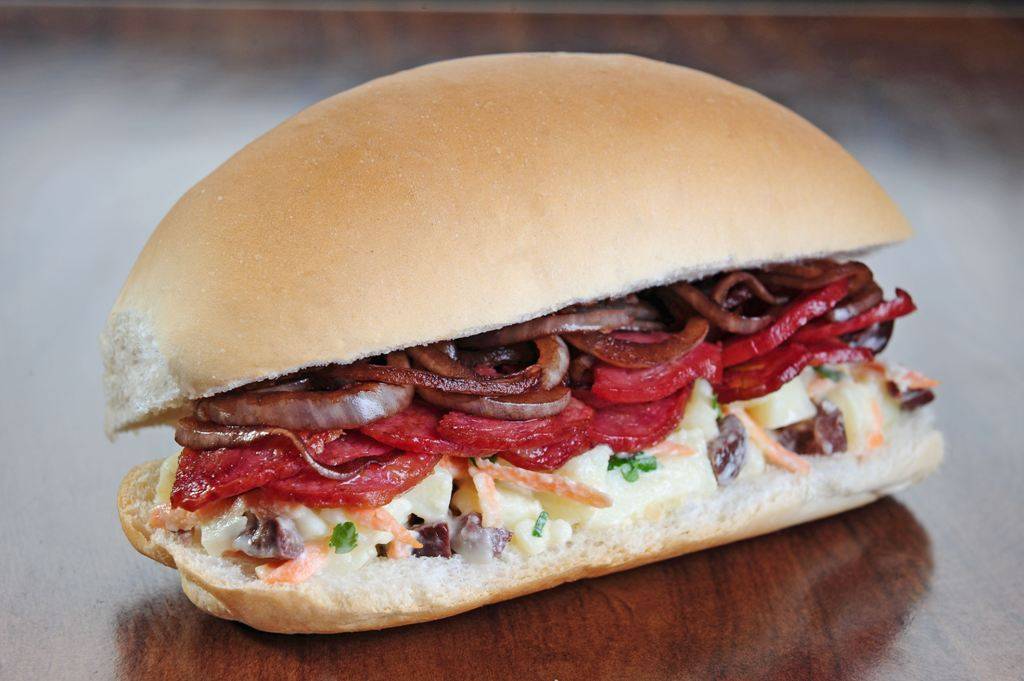Sanduíche de linguiça, com cebola ao molho shoyu e um toque especial de maionese cenoura ralada, azeitonas e cheiro verde. Novidade do Au-Au.