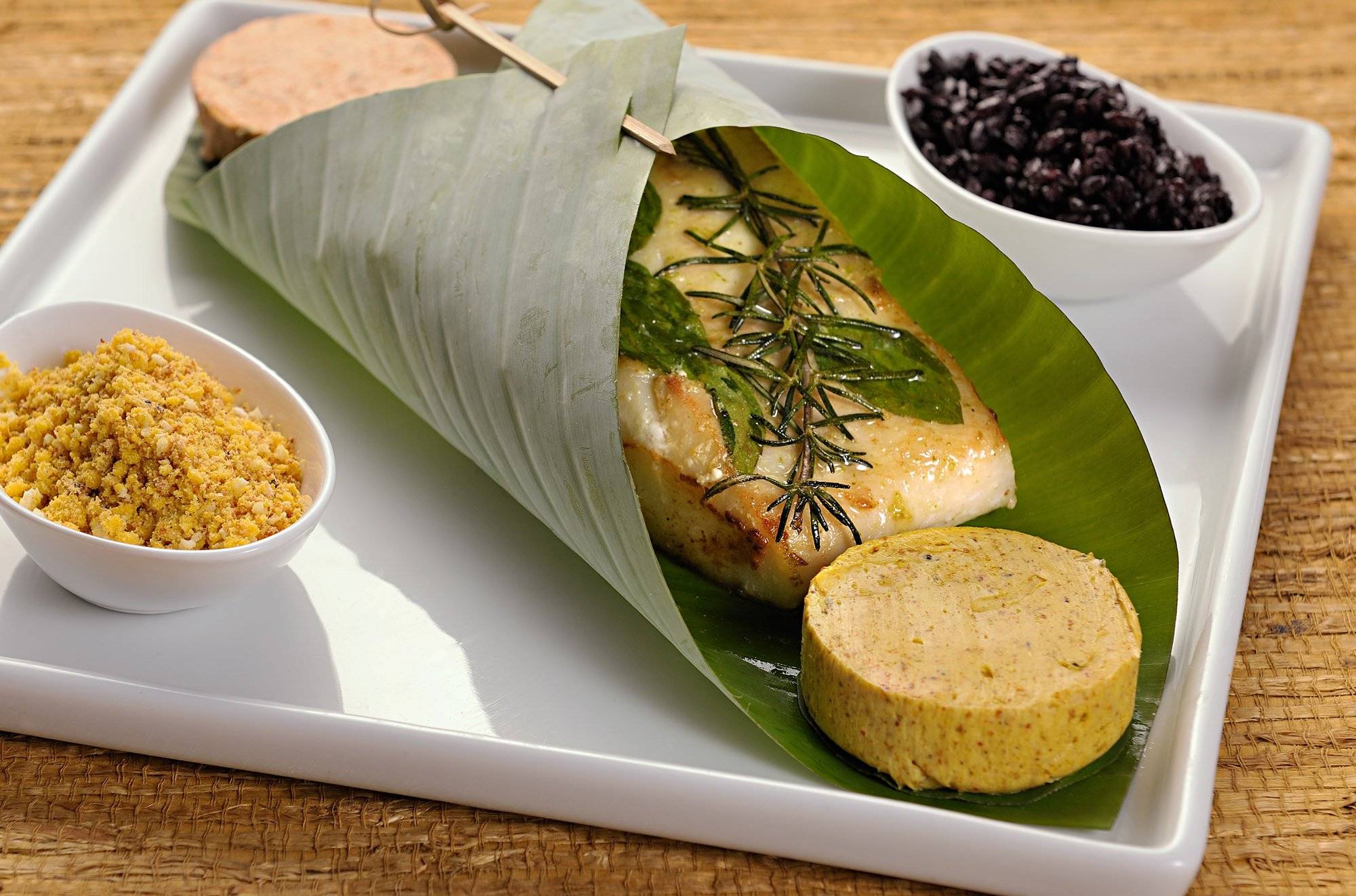 Peixe grelhado com raspas de limão, ervas e duas manteigas e farofa de dendê – o prato de Geraldine Miraglia para Antonina.