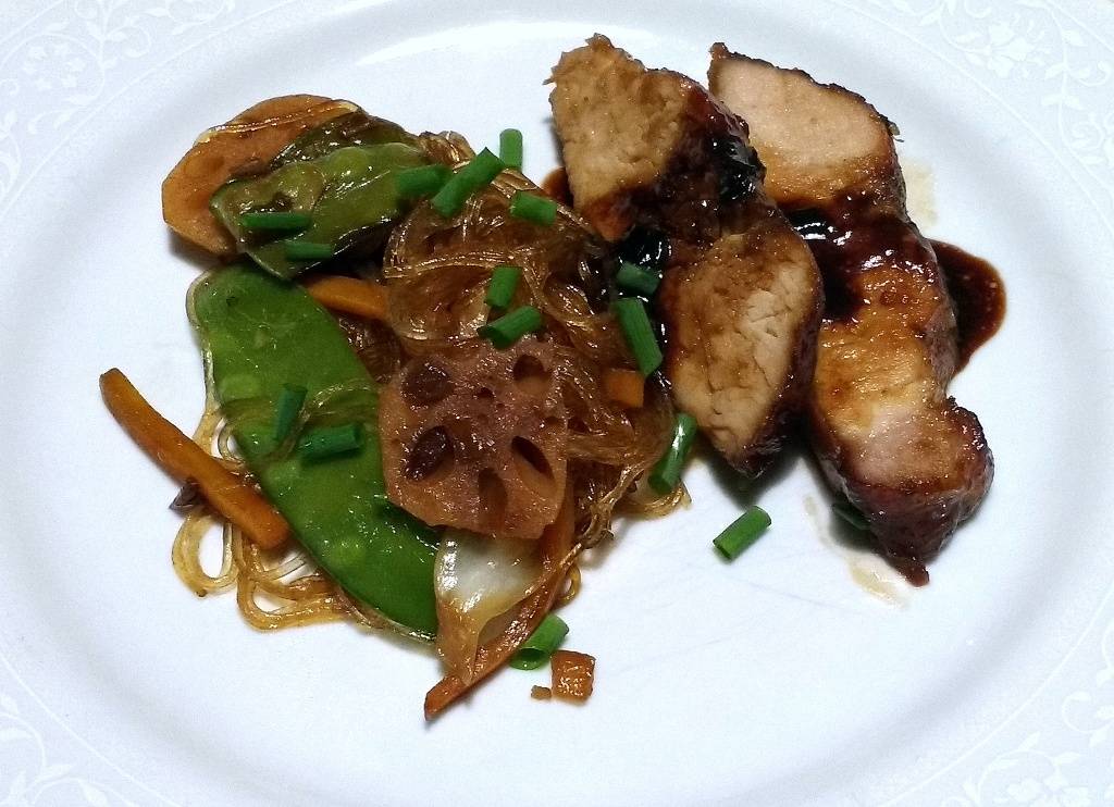 Lombo de porco laqueado, bifum com raiz de lótus e vegetais
