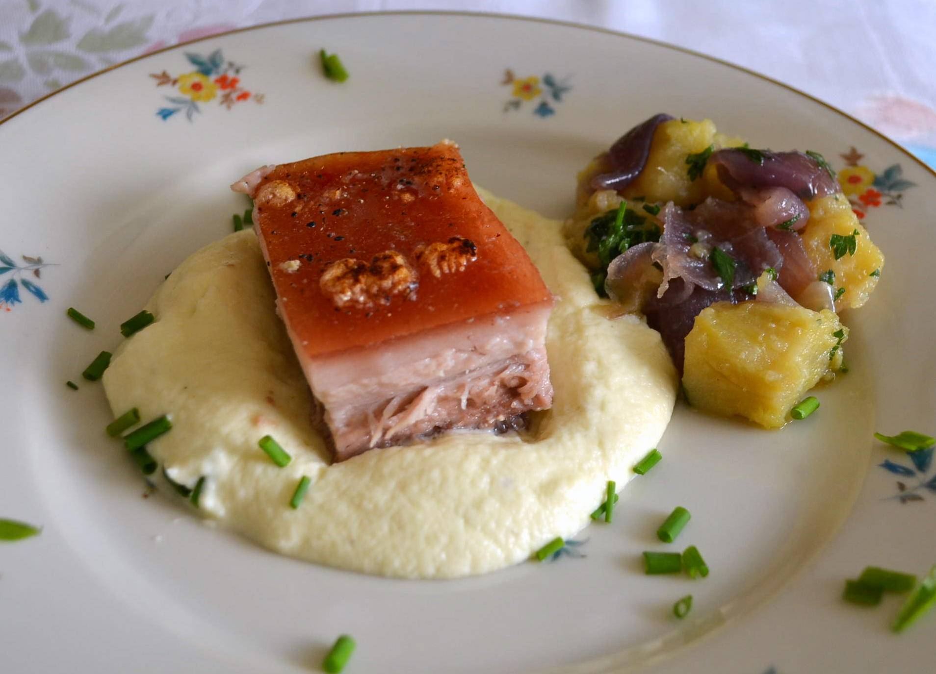 Barriga de porco assada com purê de couve-flor e batata-doce com cebola roxa confitada.