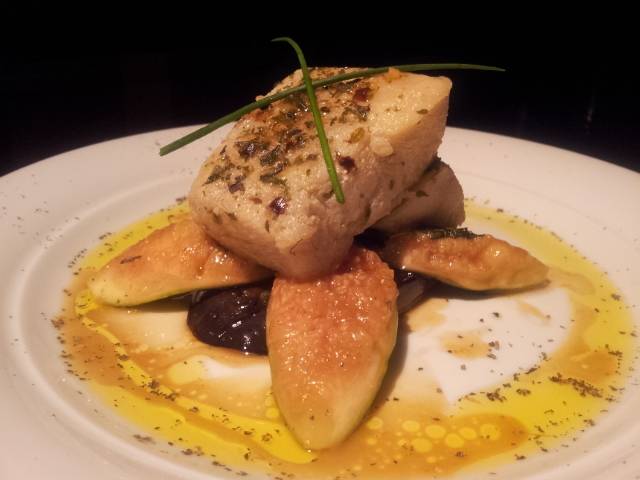 Pescada Duchamp – Filé de pescada amarela assado em cama de manjericão, acompanhado de berinjela grelhada e figo flambado na cachaça de canela.