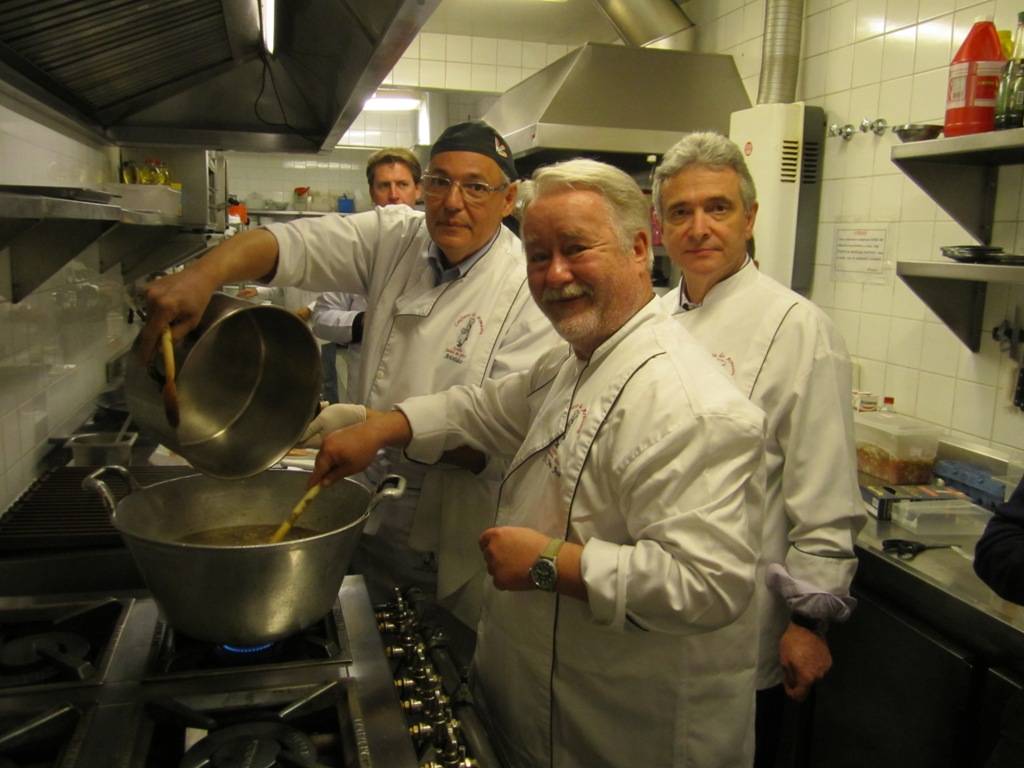 O encontro mais recente foi em outro local. Por questões logísticas não foi possível utilizar a sede da confraria, substituída pela super-bem equipada cozinha da Trattoria Boulevard, onde os confrades ficaram encantados. O grupo formado por José Aristides, J.J. Werzbitzki, Luiz Assad, Francisco Urban e Júlio Felix montou um cardápio que começava com um aperitivo bem paranaense, bem curitibano, a Carne de Onça.