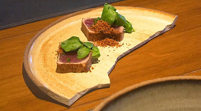 Das duas entradas, a primeira é o Lagostim com folha de arroz e creme de mandioca. O lagostim cozido no vapor é acomodado em uma cama de purê de mandioca e coberto pela folha de arroz, aquela normalmente utilizada em pratos orientais, como o rolinho vietnamita. A segunda também tem um toque oriental do chef, o Atum selado com missô de maracujá e farofa com um toque agridoce. Ambas as entradas são servidas em temperatura ambiente.