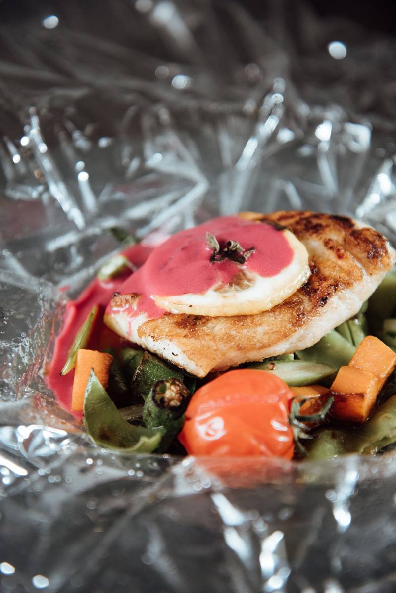 Papillote de peixe com verduras salteadas e molho champagne com beterraba.