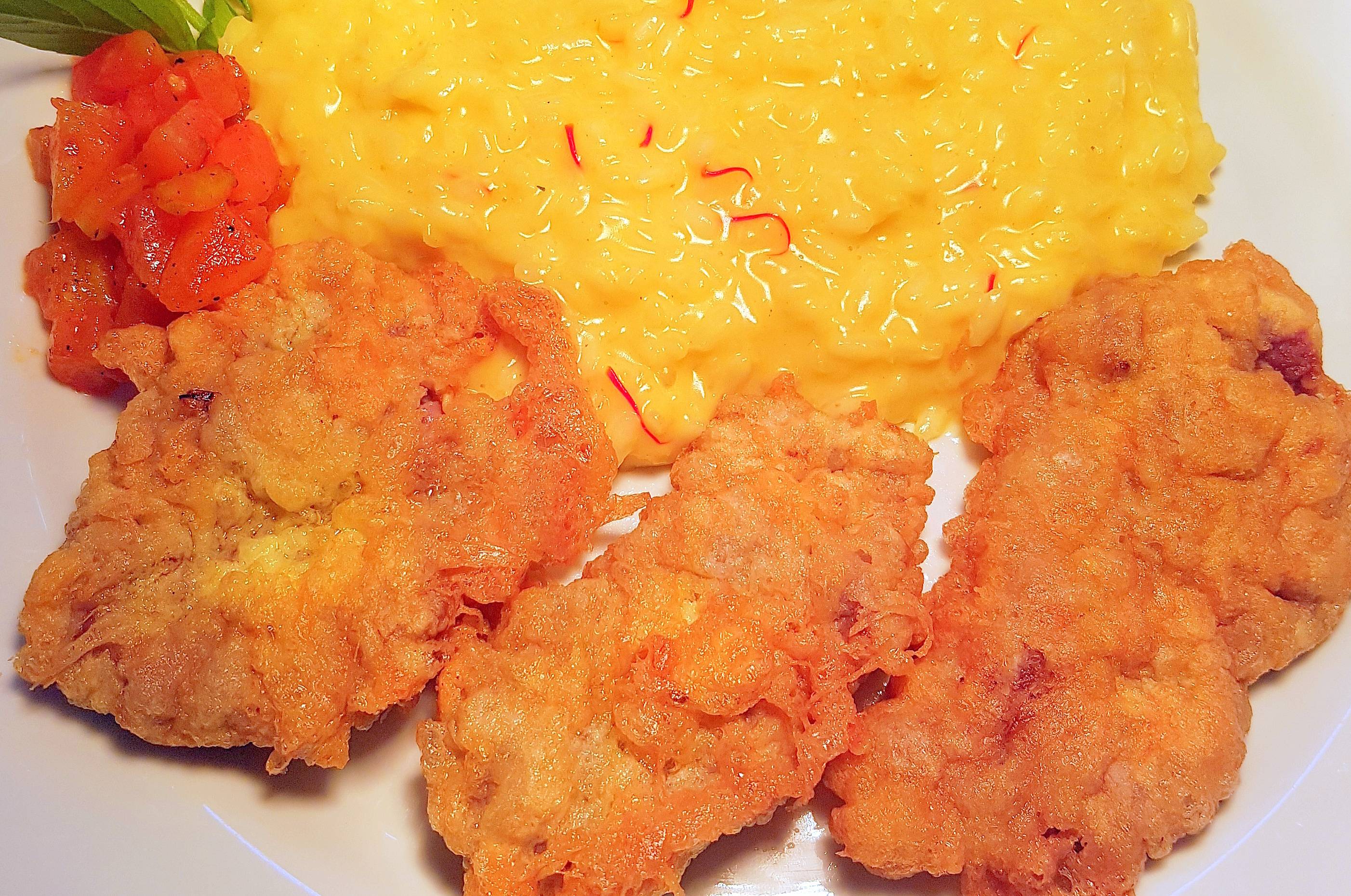 A Piccata alla milanese - escalope de vitela à milanesa, empanado com parmesão, acompanhado risoto de açafrão italiano o com os pistilos de açafrão ilustrando o prato. (Fotos/ Divulgação) (Foto: )