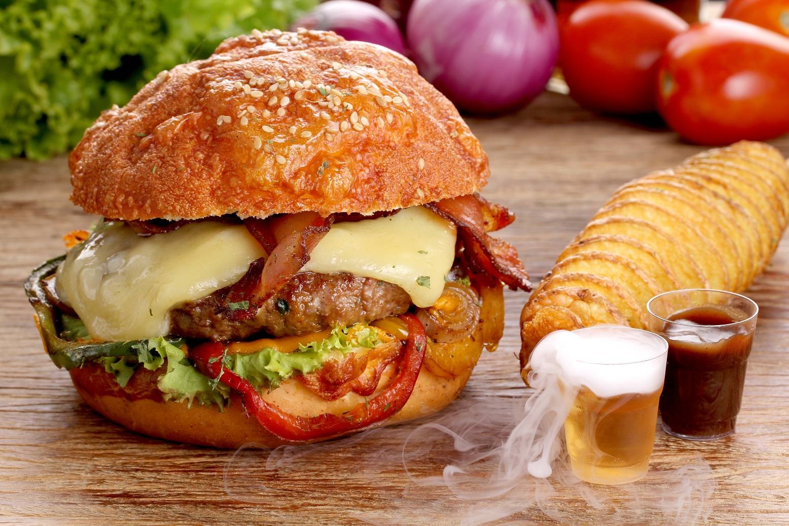 A Casa do Ferreiro: Vulcano – Pão de torresmo com crocante de queijo, hambúrguer de entrecôte, queijo prato, relish de pimentão, picles e geleia de bacon. Acompanhado por batata espiral ao molho de Jack Daniel’s com cheddar e um trago de Jack.