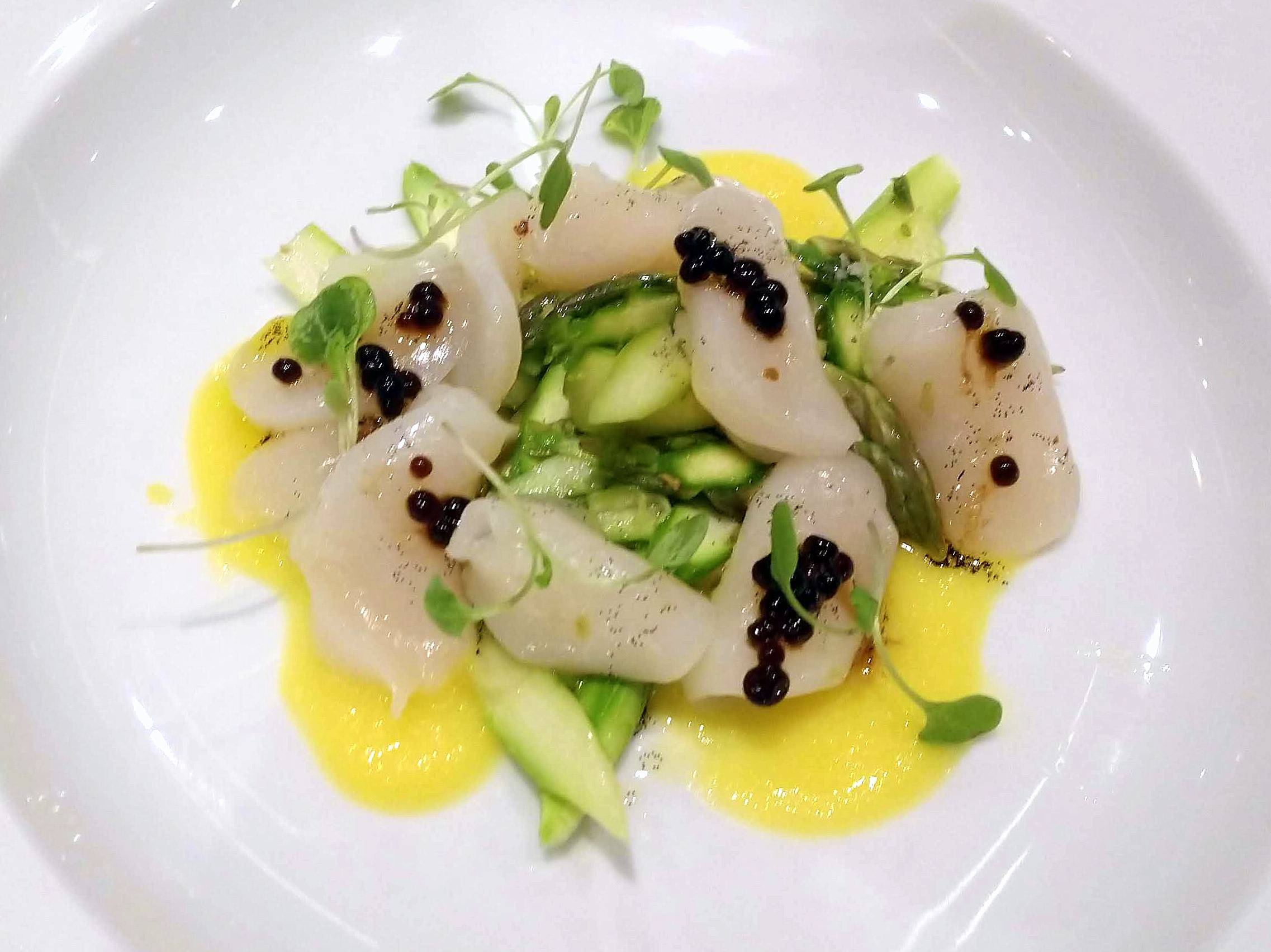Aquela gema personalizada já era um indício do que viria pela frente. Logo a seguir chegou a entrada, Carpaccio de vieiras com tiras de aspargo cru, esferas de vinagre balsâmico de Modena e creme dourado de maçã e açafrão. Delicadeza pura!