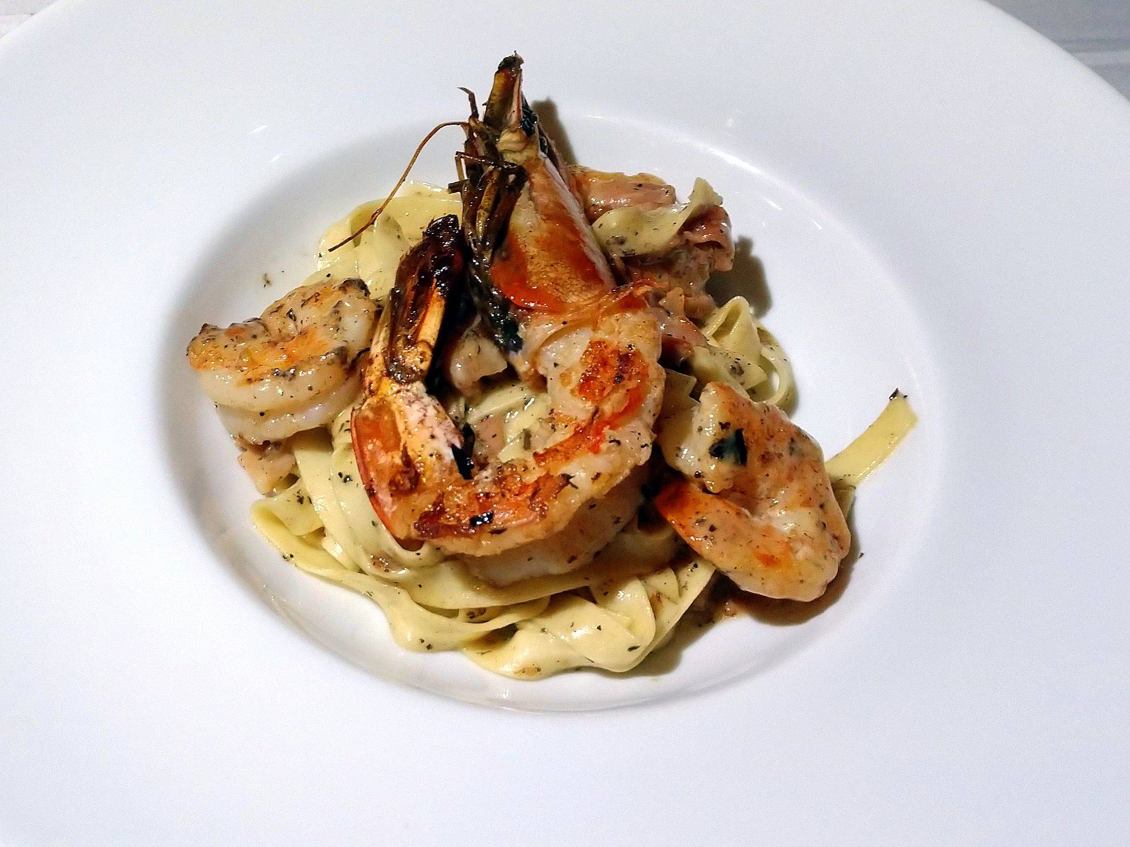 toque de molho de tomate e pesto (R$ 97) – e ambos marcam pelas apresentações bem coloridas e atraentes já a partir do visual. Completando, Tagliatelle com lascas de presunto Parma, nata fresca, Grana Padano e camarão trufado (R$ 97). Delicioso, o sabor da trufa é bem discreto e completa a composição do prato com galhardia.