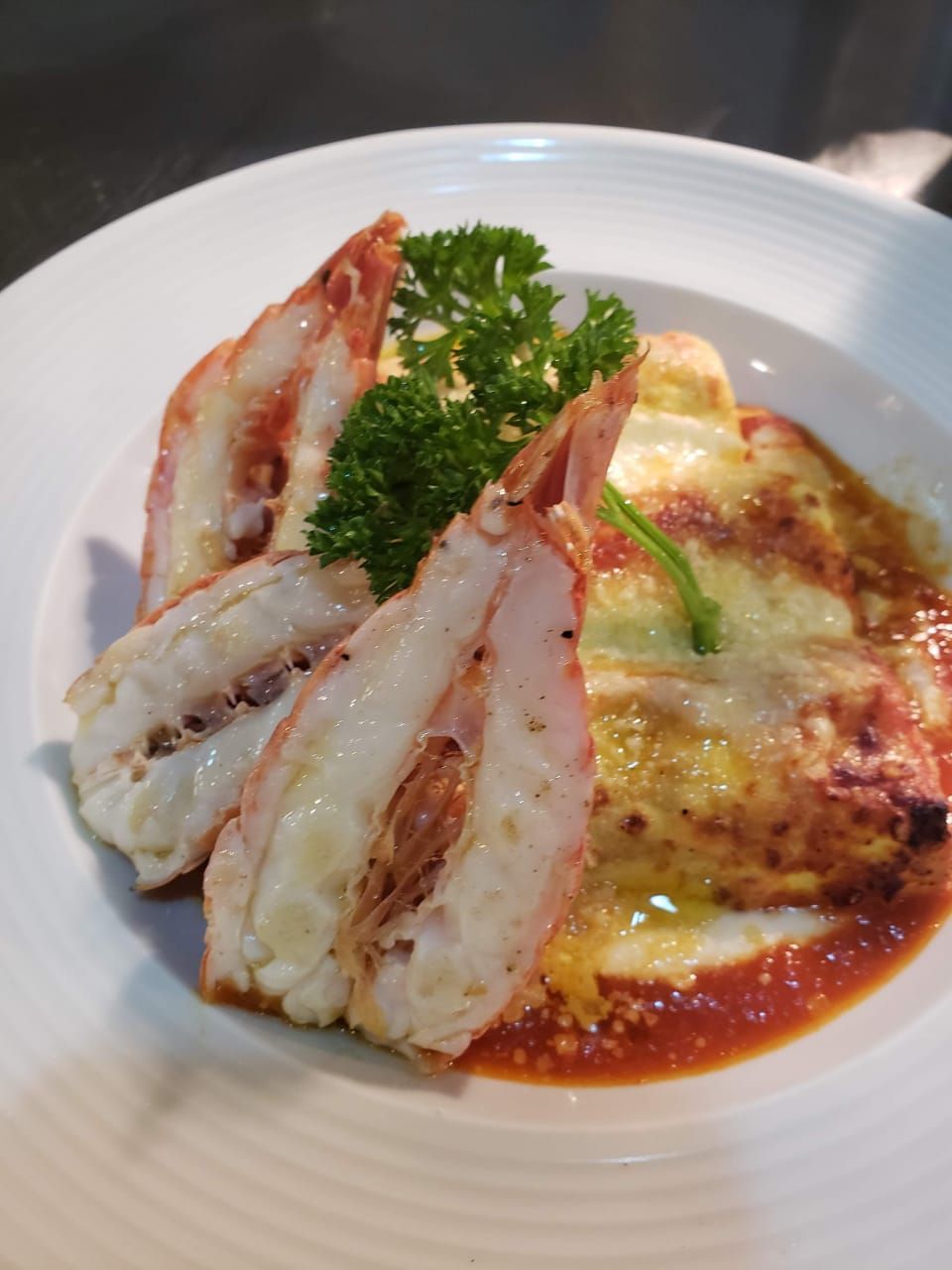 De primeiro prato, outra massa, o Cannelloni de cavaquinha levemente gratinado ao molho newburg. E, ainda no mar, o prato “di pesce”: Cauda de lagosta à moda catalana com purê de inhame e especiarias.