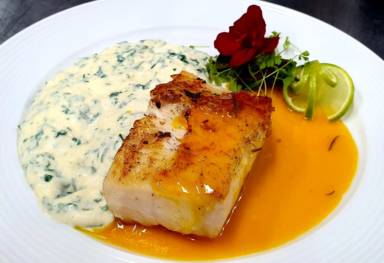 A escolha por prato principal deve ficar entre Nhoque de casa à moda romanesca com tiras de mignon, Lombo de pescada amarela ao molho de tangerina, com creme de espinafre e Sobrecoxa de frango assada à caçadora, com caponata quente.
