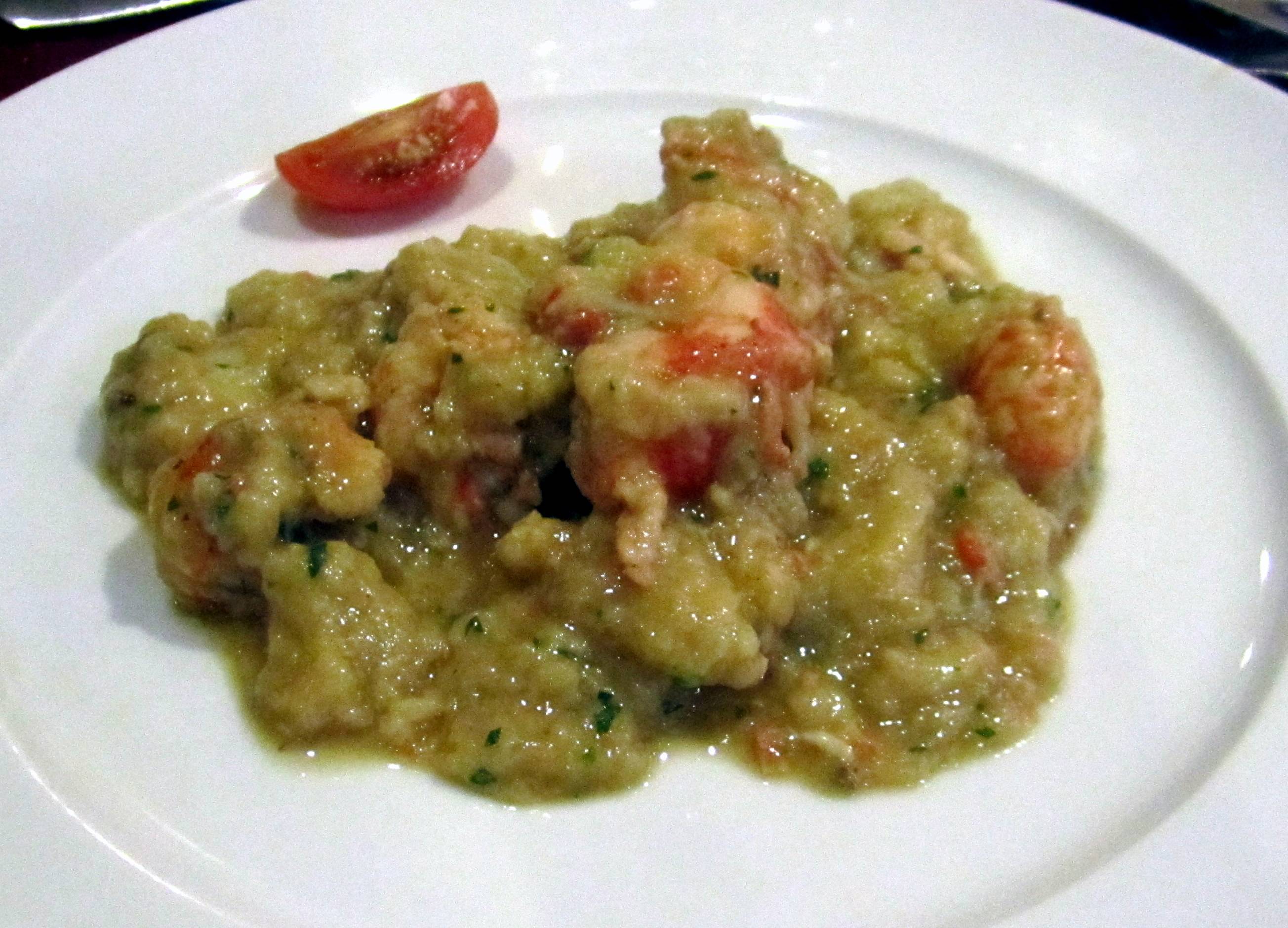 A sopa é bem consistente e tem o detalhe de as ervilhas estarem, digamos, al dente, estourando na boca quando mastigadas. Açorda é uma espécie de sopa criada pelos portugueses, alentejanos, para permitir o aproveitamento do pão amanhecido. Sopa, aliás, é uma definição muito vaga, pois parece até diminuir a importância do prato. Os pães são umedecidos no líquido do cozimento do ingrediente principal até se incorporarem e formarem uma massa. Nesse caso do Cais da Ribeira, um cremoso molho para os lagostins e o resultado final é realmente muito saboroso. O melhor prato de todo o buffet, afirmo sem medo de errar.