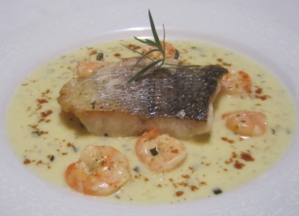 Robalo grelhado com molho cremoso de estragão, camarões e bottarga – o prato principal.
