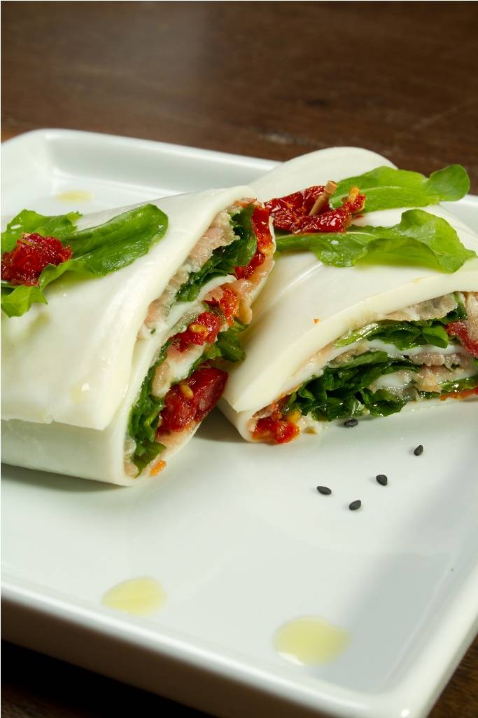 Manta de Mussarela de Búfala recheada com presunto cru, tomate seco e rúcula regada com azeite de oliva – uma das atrações no novo cardápio de petiscos da Grand Cru.