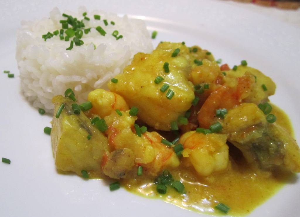 Caril de tamboril e camarão, o prato principal de uma deliciosa refeição. Pedaços de tamboril e camarão ao leite de coco e curry.