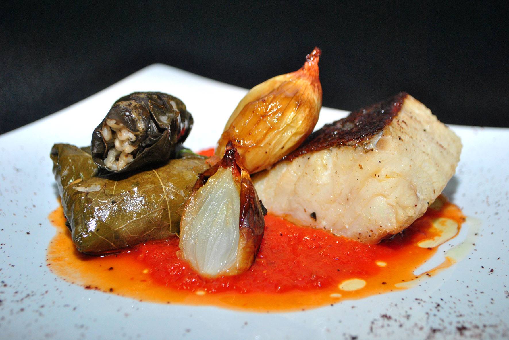 O prato principal é um Lombo de bacalhau ao forno com charutos de cevadinha. Uma inusitada combinação luso-árabe, digamos assim. O bacalhau ao forno vem sobre o molho de tomates, acompanhado de deliciosas cebolas caramelizadas. E não é quem se surpreenda com a participação especial dos charutos de folha de parreira recheados com cevadinha. Mas no todo há a interação de sabores.