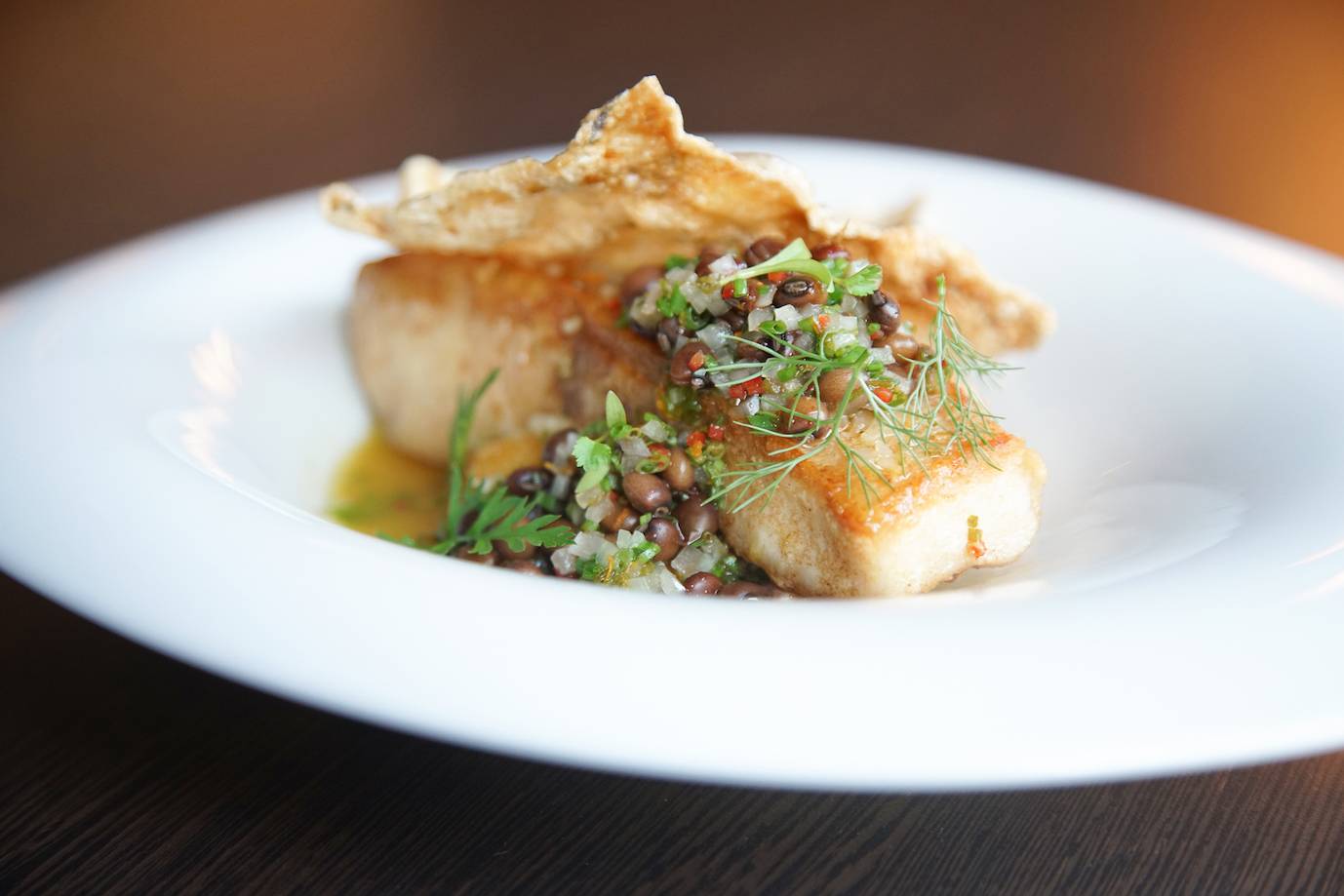 Bacalhau cod gadus morhua com quirera da Lapa, tuille de milho, o Entrecôte com alho-poró assado e farofa de mandioca.