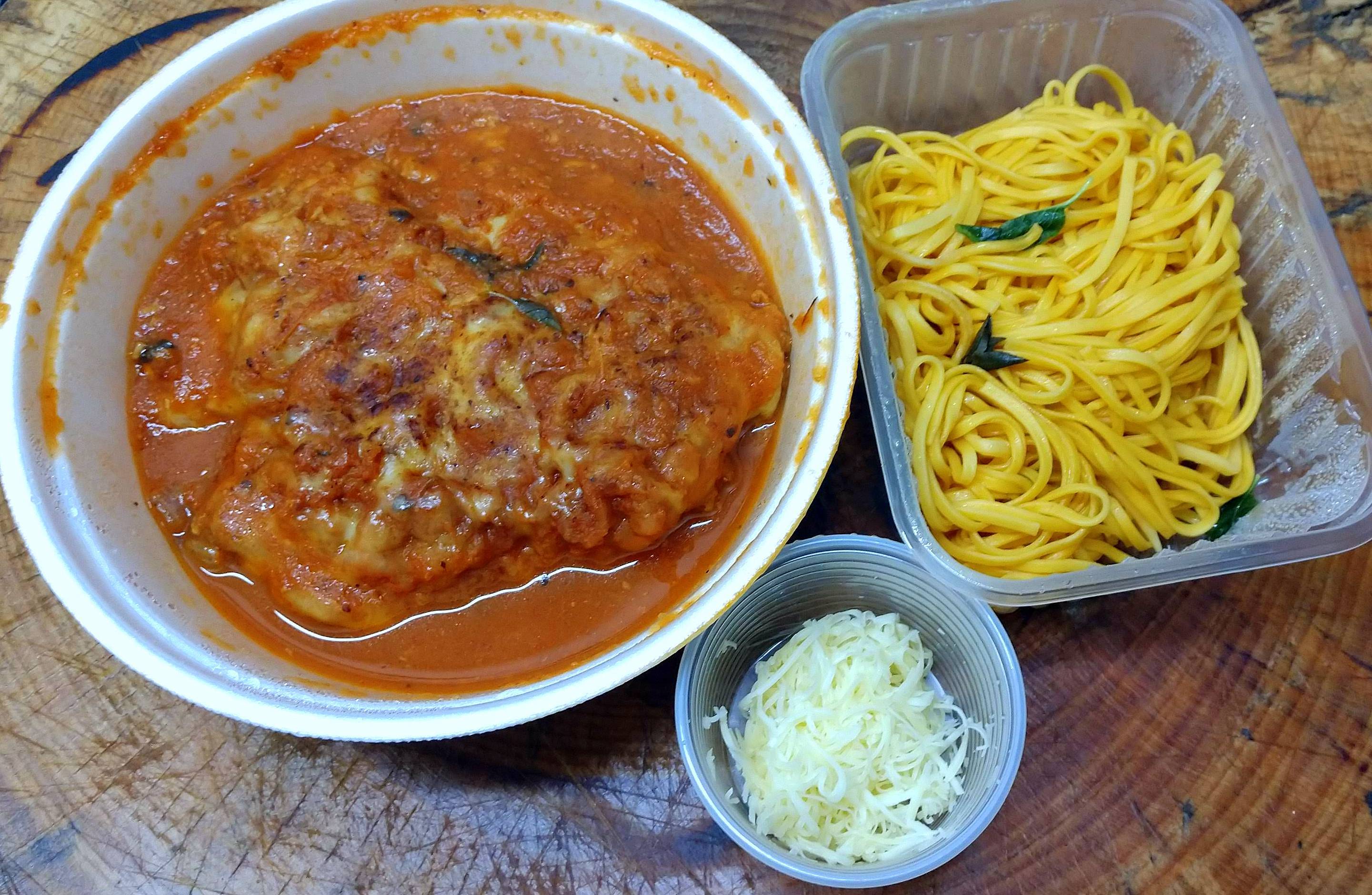 Do prato nem tenho o que dizer, uma delícia. Quando abri a embalagem de entrega achei muito para um jantar solitário. Um belo naco de carne, porção significativa de massa (caseira, desmanchando na boca), tudo bem farto. E não é que dei conta? Eu que não sou de comer muito a cada refeição.
