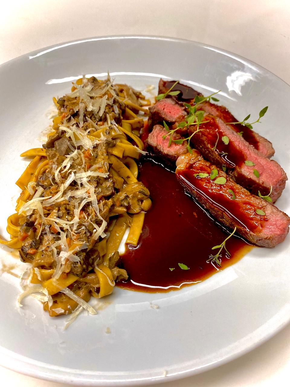 É o novo prato do mês, resultante do encontro entre o vencedor do Master Chef e sócio da casa, Vitor Bourguignon, e o chef curitibano Guile Kaesemodel. Trata-se de um espaguete artesanal do chef convidado, com ragu de cogumelos, acompanhado de entrecôte grelhado composto com um demi-glace que fecha o sabor na medida.