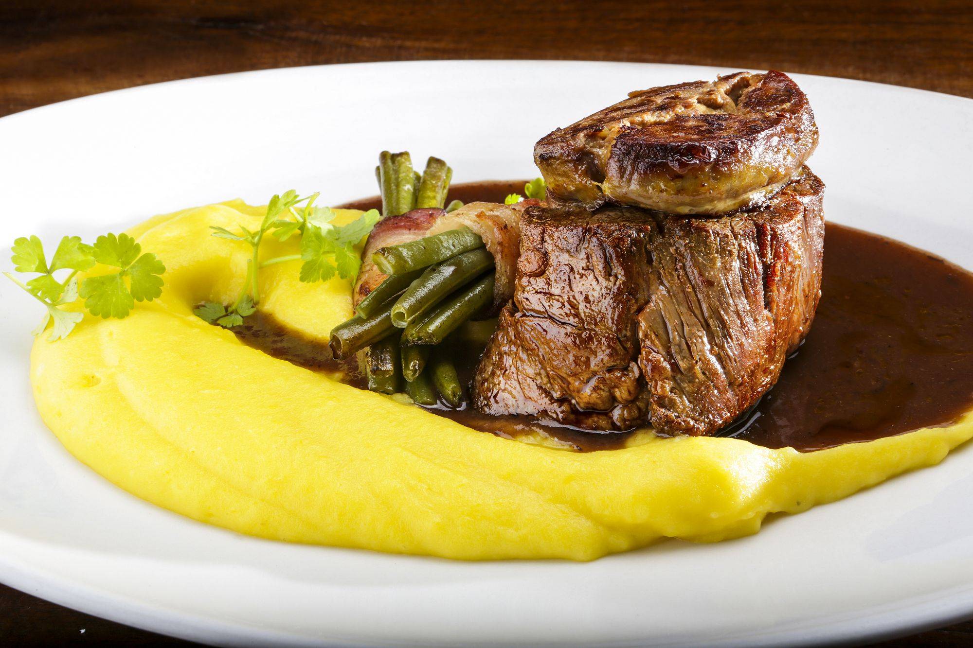 Mignon ao molho de mostarda Dijon, com tomates e cogumelos recheados e gratinados.