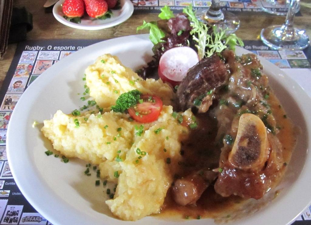 Portanto, garrão é stinco, como determinam as regras. Manzo é boi e vamos em frente. O garrão bovino é cozido lentamente em ervas e tomate e servido com tagliatelle na manteiga ou polenta cremosa amarela, que foi a opção que escolhemos. A carne vem se desmanchando, resultado do lento cozimento em fogo baixo – os colágenos também, o que nem sempre é fácil de conseguir. A combinação das ervas valoriza o sabor da carne sem ultrapassá-los. Mais um ponto para o nobre cozinheiro.