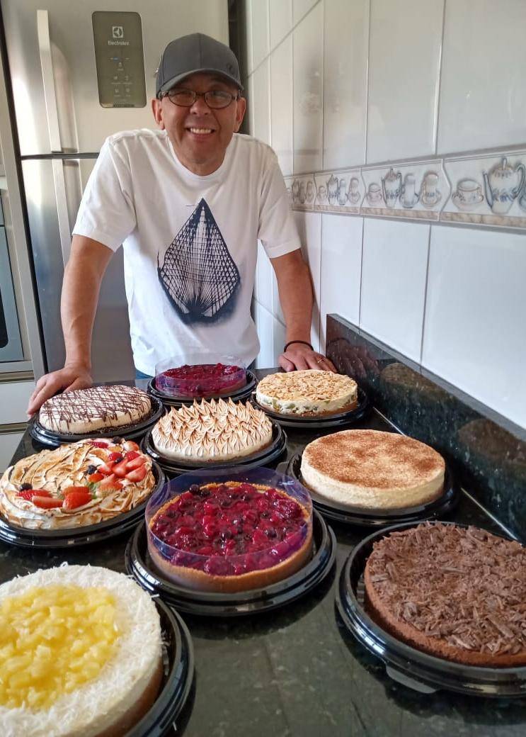Todas as tortas são artesanais e feitas por ele. E estão disponíveis em dois tamanhos: Pequena (rendimento de 5/6 fatias) e grande (rendimento de 10/12 fatias).