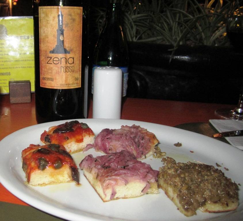 Até que um dia deu certo, o contato foi feito, reserva on-line (via facebook, coisa chique!) e tudo resolvido. O único “porém” era que o chef não estaria presente. Chegara naquele dia da Europa, viagem cansativa e ainda com o fuso horário alterado. Mas, ainda assim, não deixou de recomendar um toque de gentileza, boas-vindas à casa. Quando pensávamos em pedir a entrada, a informação: o chef pediu que servíssemos essa entrada, disse o garçom. E veio uma deliciosa Fantasia de Focacce, pedaços crocantes de focaccia em três sabores, azeitonas verdes, sardenaira e cebola roxa – o melhor de todos.