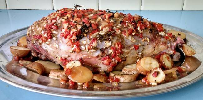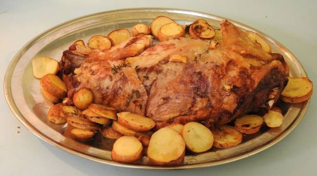 Para a receita repetida, lembrei-me de um clássico francês, Le Gigot qui pleure. Gigot é o pernil de cordeiro, o que quer dizer, mais ou menos, O Cordeiro que chora. E tem uma explicação, pois a carne é colocada numa grelha sobre uma assadeira com as batatas cortadas. Com o aquecimento do forno, começam a pingar gordura e manteiga nas batatas e as duas partes de integram.