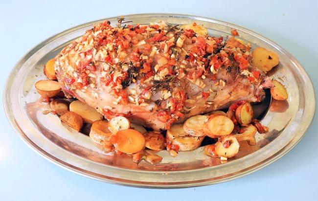 Retire o refratário do forno, deite o pernil sobre as batatas e sirva imediatamente.