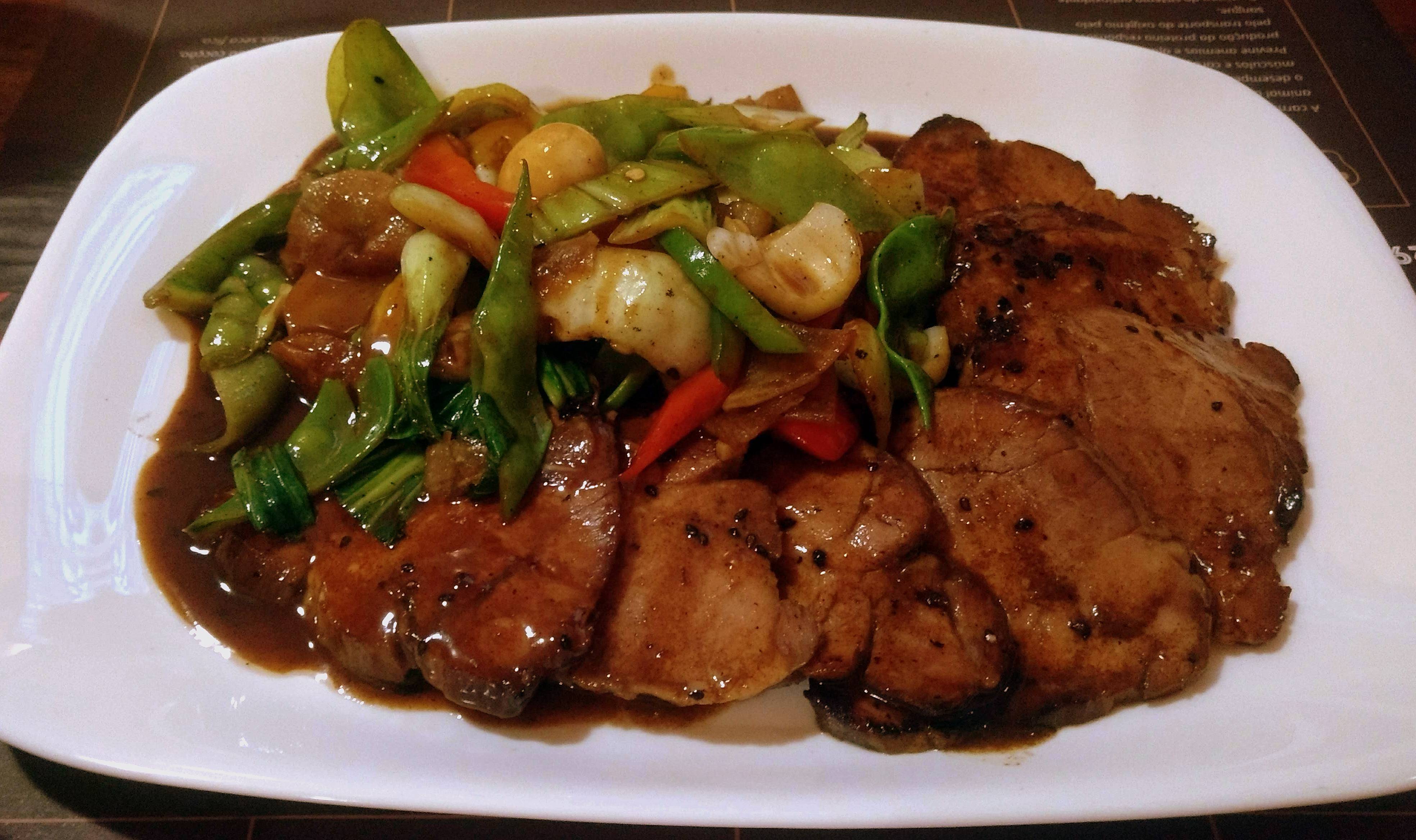 E aí veio o prato principal, o Chancho ao tamarindo, razão da visita. O corte da carne é marinado a noite inteira numa mistura de vinagre de arroz, shoyu hoisin e sete temperos chineses. No dia seguinte, forno à baixa temperatura por um longo tempo, num processo a deixar quase defumado. A carne cozida é reservada para pegar sabor e, na hora de servir, vai à wok com molho à base de tamarindo (que, segundo Matsushita, é o verdadeiro sentido do molho agridoce e não o vinagre misturado), enquanto, à parte, são salteados verduras e legumes. Junta-se abacaxi previamente cozido com açúcar e tudo é finalizado na wok, com azeite de gergelim e molho. Na preparação ainda vai nabo curtido conserva finamente cortado, com leve toque de pimenta e pak choi, aquele repolho/couve oriental, que dá mais crocância e profundidade ao prato.