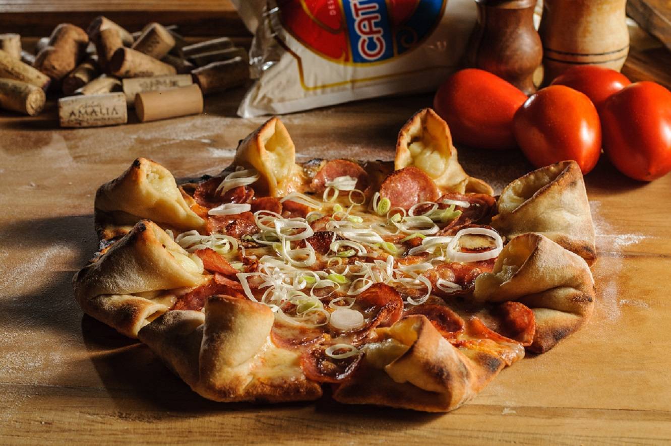 Mas o que tem o vulcão com a pizza? Tem tudo a ver, pois a borda é trabalhada em forma de uma série de pequenos “vulcões” recheados com queijo fundido. Quando assada, explicam, o queijo escorre como lava sobre o molho de tomates.