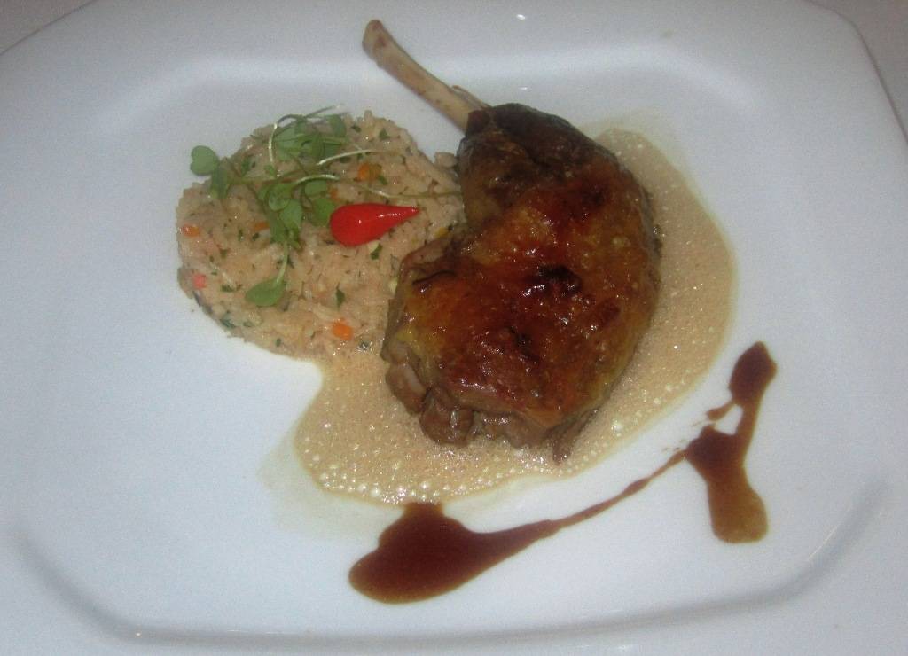 Ponha o arroz com um aro num canto do prato e no outro ajeite a coxa, passando o molho em volta. Na noite especial, o chef serviu a coxa sobre uma espuma de creme de leite, que se obtém batendo o creme de leite no mixer por alguns instantes.
