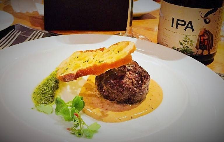 Abrindo o jantar, na recepção, há o Pão folha com molho de queijo, apresentado com a cerveja Blanche de Curitiba. Na entrada, Mini hambúrguer ao molho Dijon, servido com IPA Brut Eldorado o primeiro dos lançamentos.