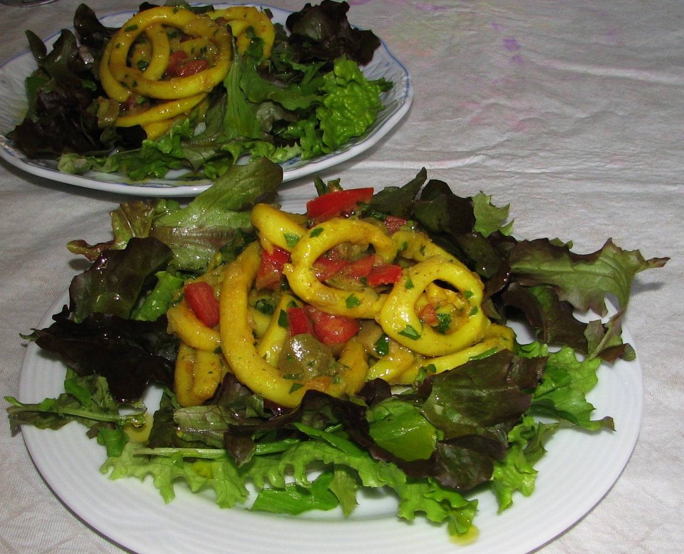 Salada de anéis de lulas flambados na cachaça – saborosa, fácil de fazer e tudo a ver com o verão.