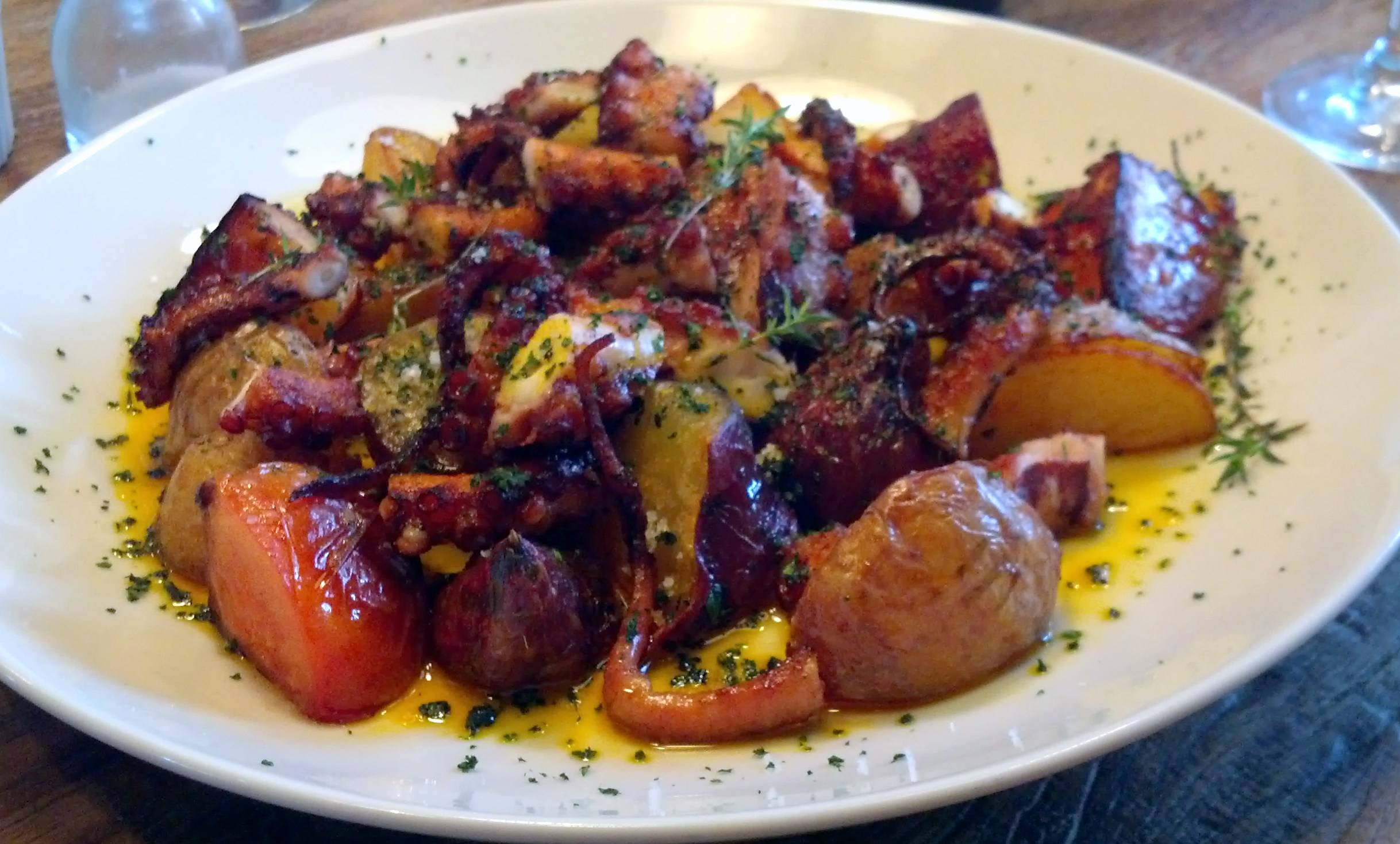 Mas o menu ainda tem Pescada com couscous cítrico, Peixe do dia grelhado, Camarões às natas, Tagliolini de camarão ao limão, Tagliolini de filé mignon, Filé mignon Kraeuterkaese (se ficou curioso, é aquele queijo cremoso que vem num tubinho amarelo e verde, que vira molho e aqui é servido com um trio de cogumelos frescos) e Filé à capixaba. E o Polvo clássico (R$ 94), é claro, que já estava chegando. São bem servidos 200g de polvo, com batatas-doces e batatas rústicas, tomate queimado e um azeite de páprica encantador. Valeu a espera, pois o polvo é muito macio (e olha que fazer polvo não é para qualquer um) e o acréscimo dos demais complementos oferece uma combinação marcante.