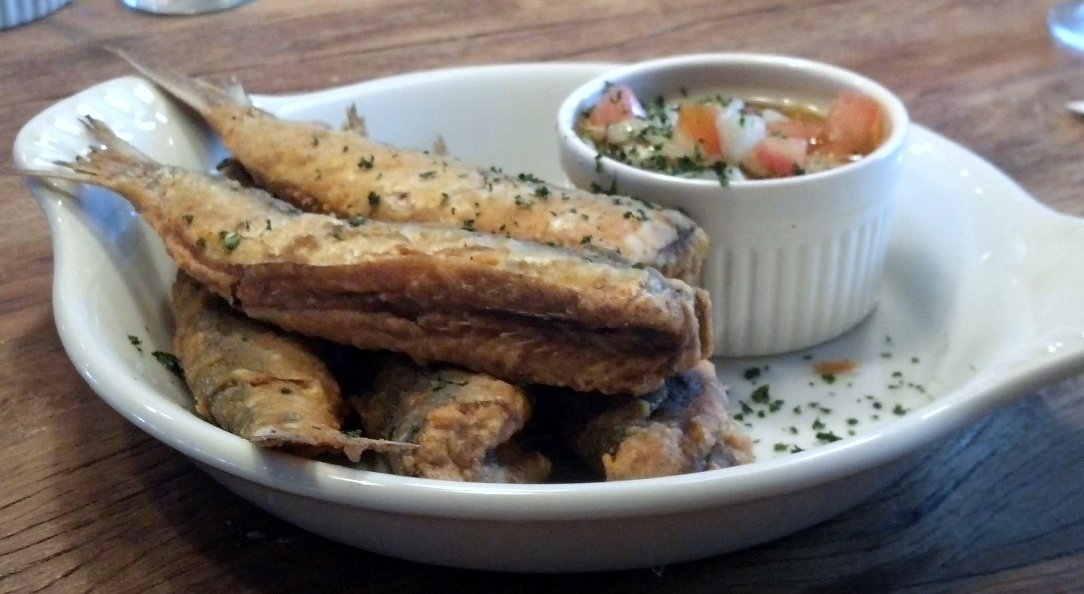 Mais uma entradinha a seguir: Sardinhas fritas (R$ 24, 3 unidades), crocantes que se desmancham na boca e vêm acompanhadas de um vinagrete de cebola, tomate e verdes. Bem interessantes, ainda que diferentes das portuguesas.