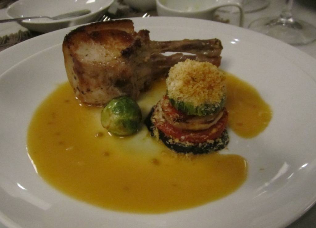 O primeiro prato da noite foi um Carré de leitão defumado ao forno com gratin de legumes, que teve a companhia de um vinho muito agradável, o Specialties Carignan 2011 (R$ 99,48). Uva de pouca difusão por lá, a Santa Carolina encontrou vinhedos históricos de pequenos produtores da Carignan com plantas entre 60 e 80 anos de idade, a partir das quais se produz um vinho complexo e singular. É a expressão de um terroir até então esquecido. Cor rubi com aromas de amoras e toques de violetas, além de notas florais e terrosas. Com acidez balanceada, complexo, foi uma bela surpresa.