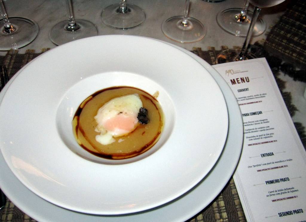 Bem refrescante, o vinho escoltou bem os petiscos e foi melhor ainda com a entrada do chef, o Ovo “perfeito” com purê de mandioca e trufas – o que foi surpreendente, pois o ovo não costuma ser o companheiro mais fiel nessas horas de harmonização. E o ovo perfeito é excepcional. Já havia experimentado o que Freire fez em evento no Centro Europeu e desde então me encantei pelo resultado final do processo de cozimento na temperatura constante de 65%. Com o aveludado purê de mandioca e a lasca de trufa, então…