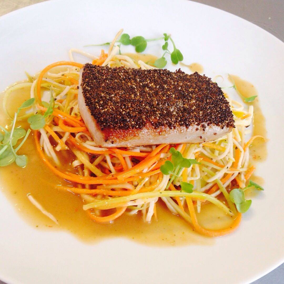Nos pratos principais, a escolha pode ser entre Conchiglione de bacalhau com natas, Atum em crosta de chia ao molho oriental, com espaguete de pupunha ou Picatta de alcatra ao chimichurri, com legumes grelhados.