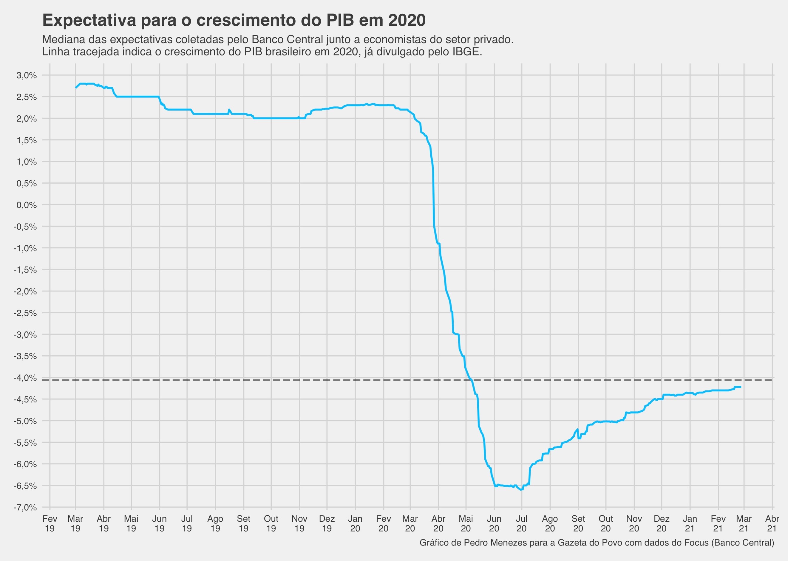 O gráfico abaixo mostra como evoluíram as expectativas para o crescimento do PIB brasileiro em 2020. Eles foram retirados do Focus, relatório do Banco Central coleta as previsões de economistas do setor privado para os principais indicadores econômicos do Brasil. A queda de 4,1% foi grande, mas menor do que se esperava.