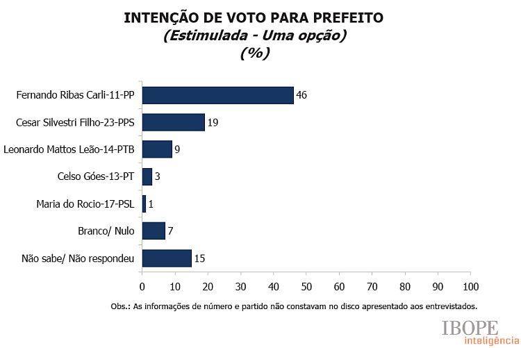 O candidato Fernando Ribas Carli (PP) aparece na liderança da disputa pela prefeitura de Guarapuava, região Central do estado. Na primeira pesquisa do Ibope, divulgada nesta terça-feira (12), Carli aparece com 46% das intenções de voto. Na segunda posição está Cesar Silvestri Filho (PPS), com 19%.