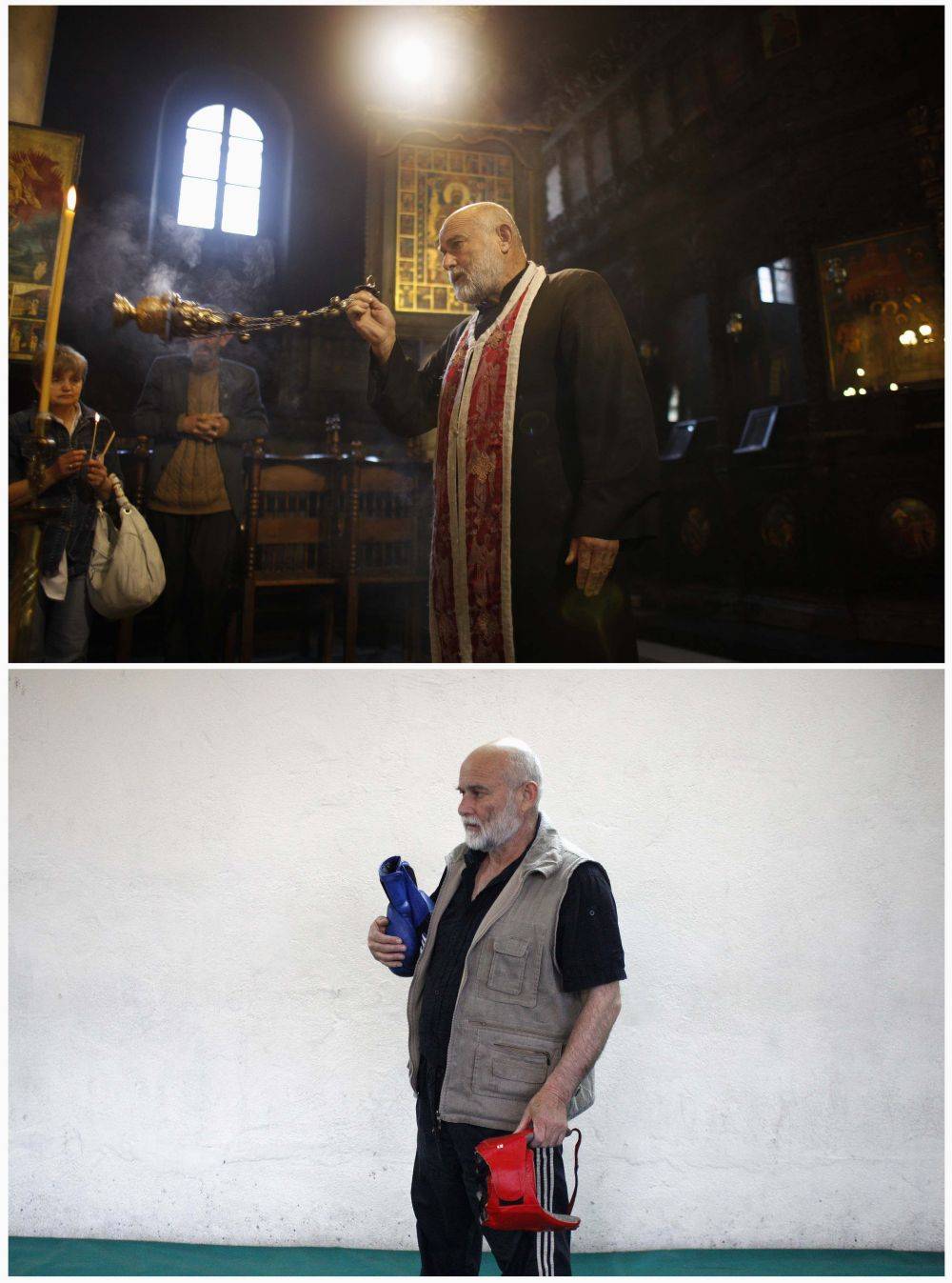 O padre Andon apresenta a virgem abençoada na imagem de cima e, abaixo, ele é flagrado em um treino de boxe na cidade de Blagoevgrad, na Bulgária. Aos 60 anos, o clérigo ortodoxo treina mais de 30 crianças de um orfanato local, muitas delas já ganharam competições internacionais.
