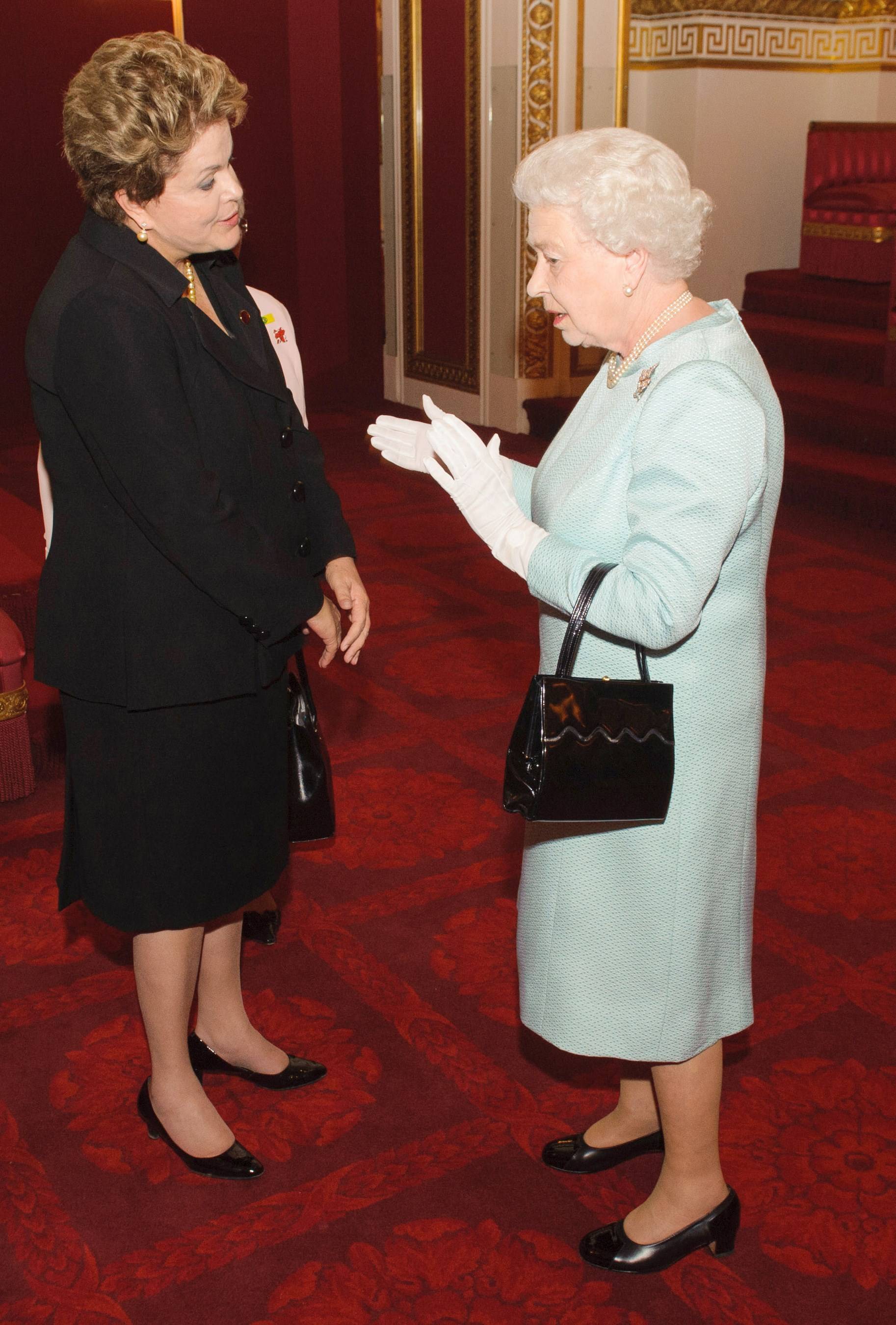 A presidente Dilma Rousseff com a rainha Elizabeth II (à direita), no Palácio de Buckingham, em Londres.
