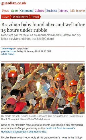 O site do jornal britânico Guardian deu destaque esta semana para o salvamento do menino Nicolas Barreto, o bebê brasileiro de seis meses que ficou mais de 15 horas soterrado em Nova Friburgo, na região serrana do Rio de Janeiro – devido às chuvas que castigam a área. Seu pai, Wellington da Silva Guimarães, que protegeu a criança com o próprio corpo, foi liberado pelos médicos após exames. O mesmo aconteceu com o garoto. Sua mãe e a avó materna, porém, morreram soterradas. Na foto postada no site, vê-se o exato momento do salvamento, bem como o alívio e comemoração da equipe de resgate.