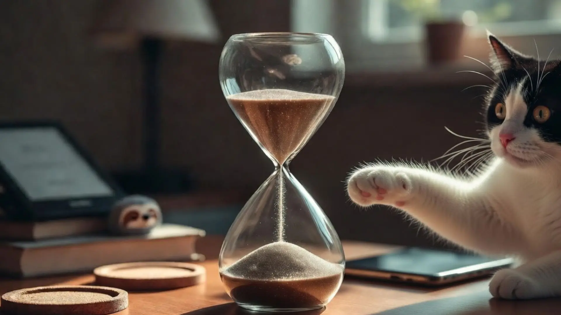 A ampulheta que está no meu criado-mudo, juntamente com o que minha mulher chama carinhosamente de “tralha”: uma pilha de livros, o Kindle, dois porta-copos que não uso e só me rendem broncas, uma luminária, um bicho-preguiça de pelúcia (seu sei), o carregador do celular, o próprio celular e, ocasionalmente, o estojo do alinhador dental.
