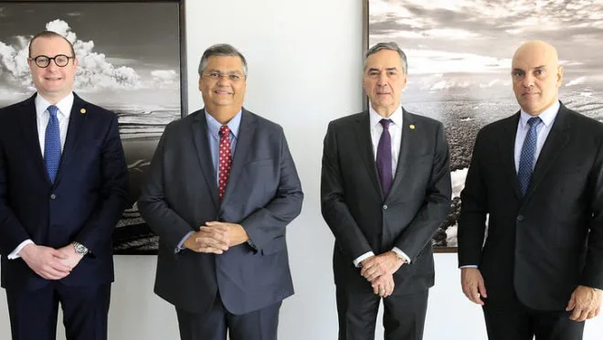 Vi a imagem acima e pensei o óbvio: parece uma banda. Estou falando de Cristiano Zanin (teclado), Flávio Dino (bateria), Barroso (baixo) e Moraes (guitarra e voz). Restavam duas dúvidas. A primeira: qual o gênero musical desse conjunto? Será que é rock ou está mais para... forró? Nesse caso convém botar o Flávio Dino para tocar triângulo. Combina com o ridículo da situação.