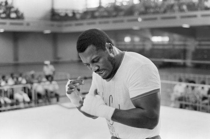 Joe Frazier treinando para enfrentar George Foreman na decisão dos pesos pesados de 1973